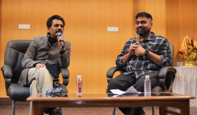 लखनऊ, कैनविज टाइम्स संवाददाता। नेटफ्लिक्स की फ़िल्म रात अकेली है: द बंसल मर्डर्स के आने से पहले नवाज़ुद्दीन सिद्दीकी नेशनल कॉलेज लखनऊ पहुँचे। जहां उन्होंने छात्रों से बातचीत की, जिसमें उन्होंने अपने फ़िल्मी सफ़र की बातें बताईं और आने वाली फ़िल्म के बारे में जानकारी दी। यह फ़िल्म 19 दिसंबर को रिलीज़ होगी। बातचीत में नवाज़ुद्दीन ने लखनऊ से अपने ख़ूबसूरत रिश्ते के बारे में बताया और उसके साथ अभिनय कैसे करते हैं और अपने काम पर टिके रहने की ज़रूरत के बारे में सरल शब्दों में बताया। उन्होंने यह भी कहा कि मुश्किल और अलग-अलग तरह के किरदार निभाना आसान नहीं होता। साथ ही, उन्होंने जटिल यादव के रोल में वापसी के बारे में बताया कि इस बार कहानी में तेज़ जाँच के साथ कुछ और गहरे मोड़ देखने को मिलेंगे। इस बातचीत में छात्रों ने पूरे उत्साह से भाग लिया और कहानी, अभिनय और फ़िल्म इंडस्ट्री पर सवाल पूछे। नवाज़ुद्दीन ने बताया कि रात अकेली है: द बंसल मर्डर्स एक हैरान करने वाले मामले पर बनी फ़िल्म है।