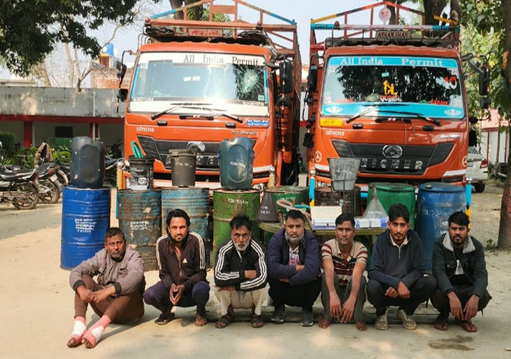 उत्तर प्रदेश के सीतापुर में पुलिस ने मंगलवार काे हाईवे पर खड़े ट्रकों से डीजल चोरी की वारदातों को अंजाम देने वाले शातिर अंतरजनपदीय गैंग का पर्दाफाश करते हुए सात आरोपियों को गिरफ्तार किया है। इनके पास से करीब 1200 लीटर डीजल, दो डीसीएम वाहन, तीन अवैध तमंचे, कारतूस, डीजल चोरी करने के उपकरण और फर्जी नंबर प्लेटें बरामद हुई हैं। पुलिस अधीक्षक अंकुर अग्रवाल के निर्देशन में अपर पुलिस अधीक्षक दक्षिणी दुर्गेश कुमार सिंह और क्षेत्राधिकारी सिधौली कपूर कुमार के नेतृत्व में कमलापुर पुलिस व क्राइम ब्रांच की टीम ने यह कार्रवाई की। यह वही गैंग है जिसने 23 नवंबर को थानाक्षेत्र कमलापुर में जियो पेट्रोल पंप के पास खड़े ट्रक से मशीन लगाकर करीब 200 लीटर डीजल चोरी किया था। पकड़ में आने के डर से आरोपियों ने पीछा करने वाले ट्रक चालकों पर गाड़ी चढ़ाने तक की कोशिश की थी। गिरफ्तार किए गए अभियुक्तों की पहचान अनवर, इरफान, शराफत उर्फ भूरा, जाहिर, तसलीम, मुकर्रम और अरविंद के रूप में हुई है। इनमें से अधिकांश हापुड़, गाजियाबाद और मेरठ के निवासी हैं, जबकि डीजल को जमा कर बेचने का काम महोली क्षेत्र के आरोपित अरविंद की दुकान से होता था। गिरोह ने डीजल चोरी के लिए डीसीएम वाहनों को खास तौर पर मॉडिफाइड कर अतिरिक्त टैंक बनाया था। साथ ही समय–समय पर अलग नंबर प्लेट लगाकर अपराध को अंजाम देते थे। पूछताछ में आरोपियों ने स्वीकार किया कि वे हाईवे के किनारे खड़े ट्रकों से मशीन और पाइपिंग के जरिए डीजल निकालते थे और चोरी का माल अलग-अलग जगह सप्लाई करते थे। बरामद दोनों डीसीएम वाहनों को पुलिस ने सीज कर दिया है। पूरी कार्रवाई में तत्परता दिखाने पर पुलिस अधीक्षक ने कमलापुर थाना और एसओजी टीम को 25,000 रुपए का पुरस्कार देने की घोषणा की है। मामले में गिरफ्तार आरोपियों पर बीएनएस की विभिन्न धाराओं और आर्म्स एक्ट में मुकदमा बढ़ाते हुए उन्हें न्यायालय के हवाले कर दिया गया है। पुलिस अब गिरोह से जुड़े अन्य लोगों की तलाश में जुटी है।